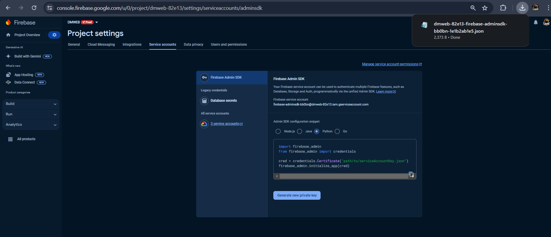 ** Next GoTO Service Accounts and Click on Generate New Private Key Button