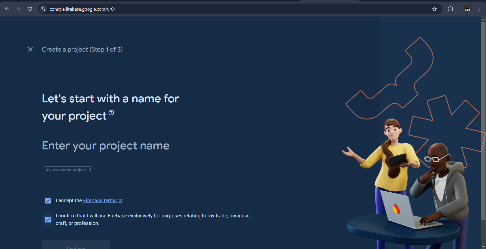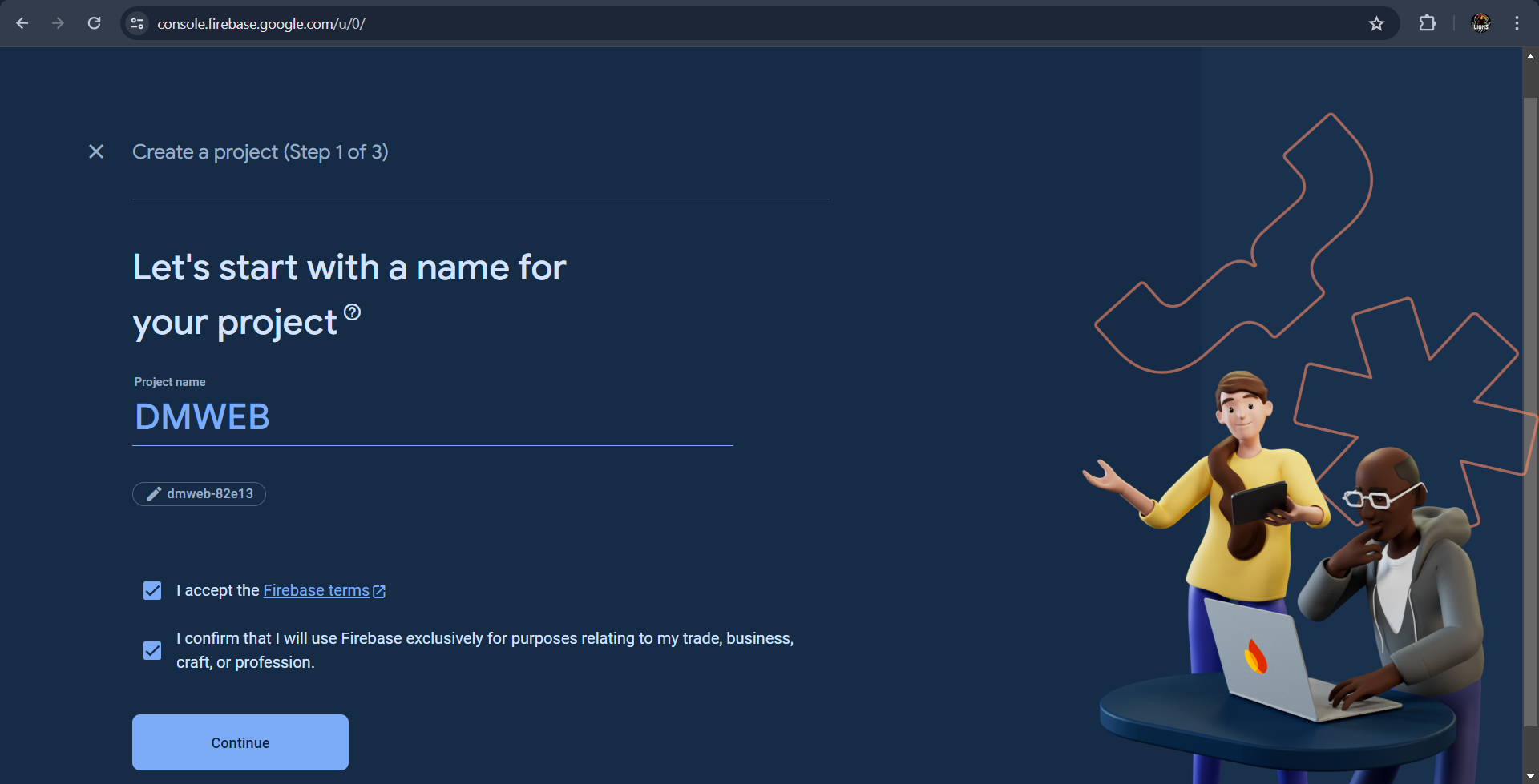 Next, give a name to the project (eg. DMWEB ) and Click on Continue Button