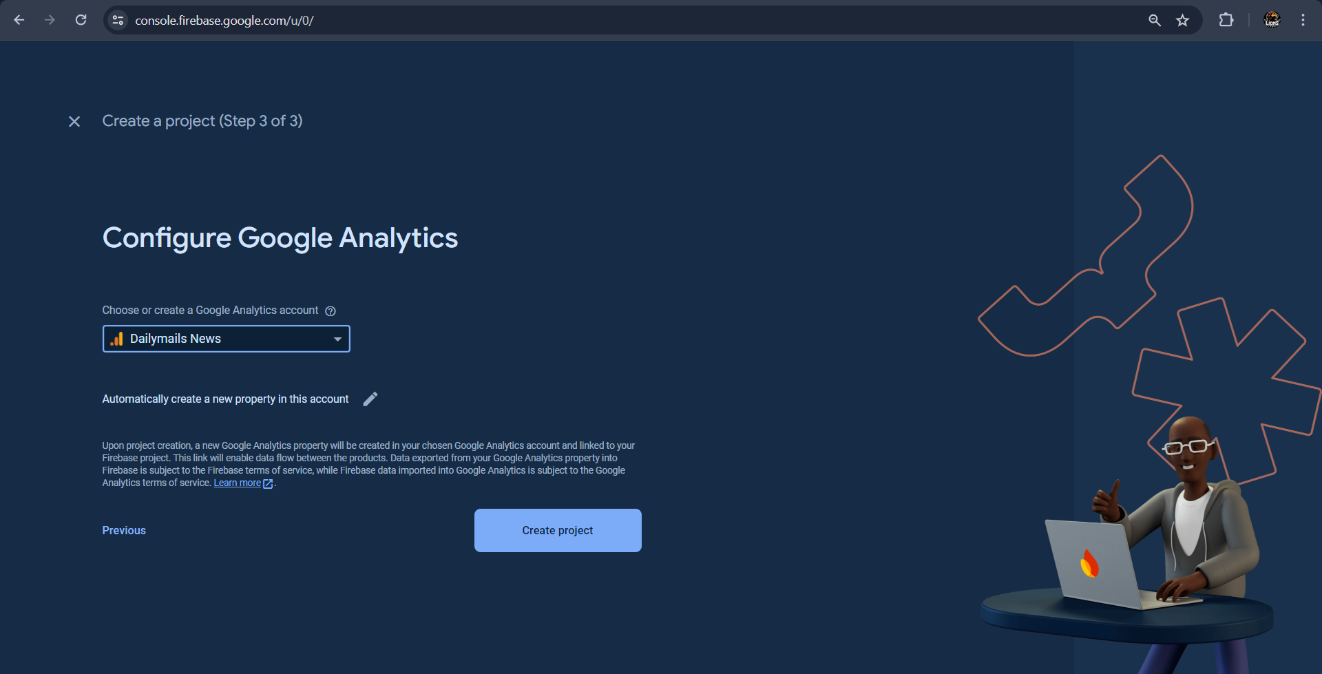 Select Google Analytics account and Click on Create Project Button